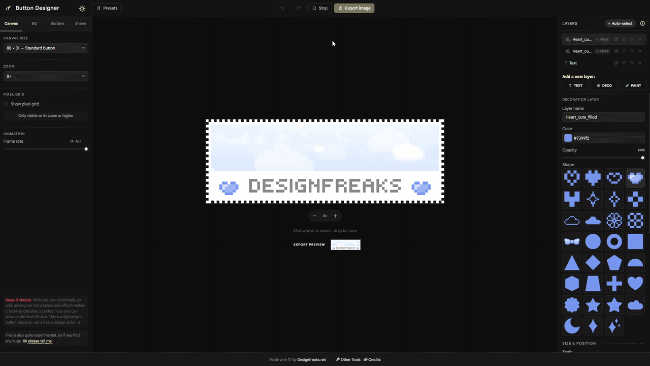While you can technically go wild, adding too many layers and effects makes it tricky to calculate a perfect loop and can blow up the final file size. This is a lightweight button designer, not a heavy design suite. <3
